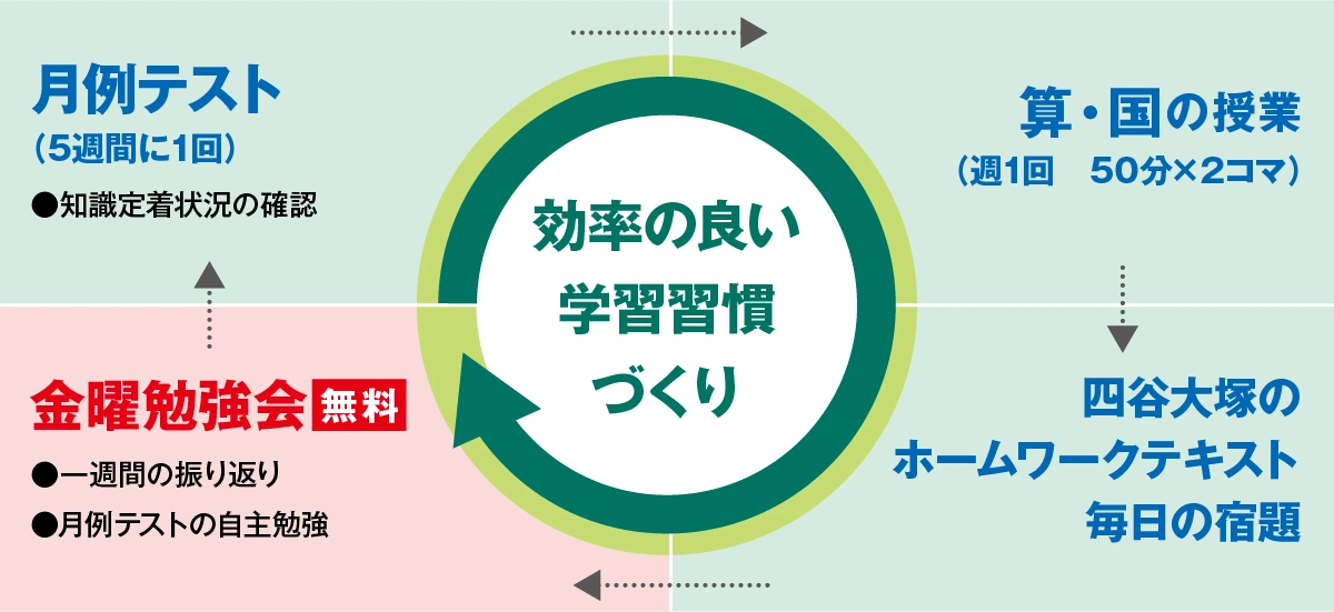 その週に学習した内容を、その週のうちに復習するという学習習慣、学習サイクルを1年間かけて身につけ4年生進級時にしっかりした基礎力を築きます。