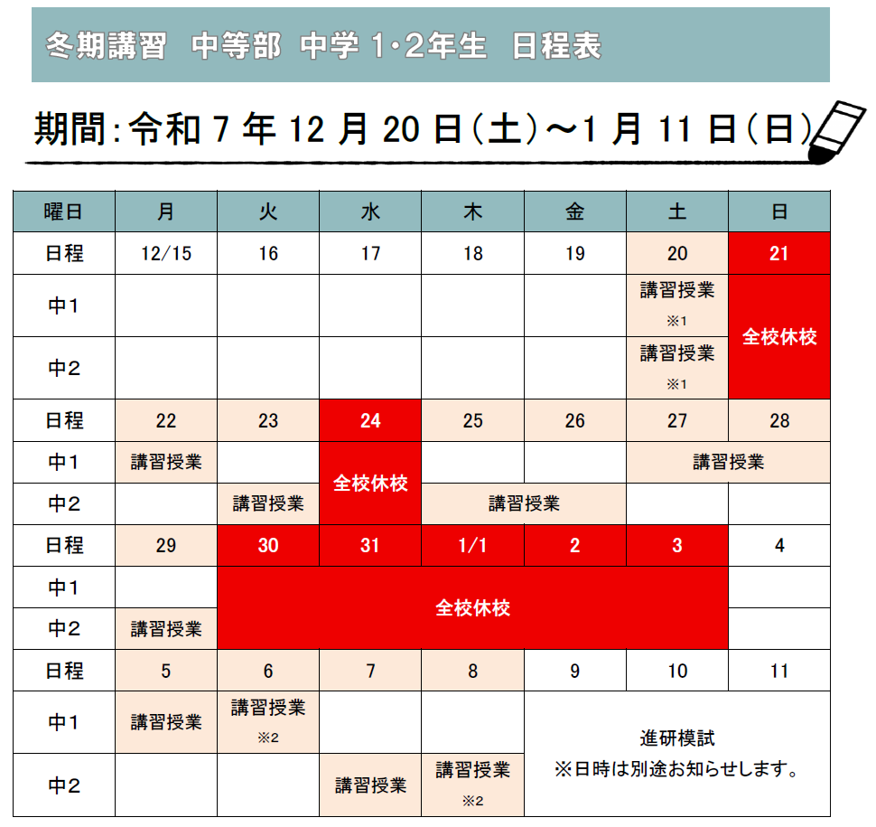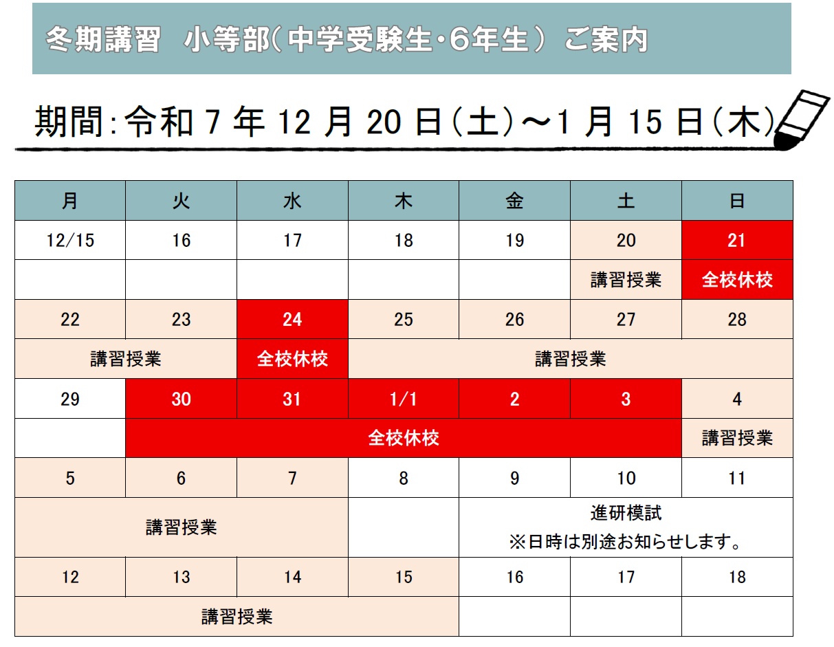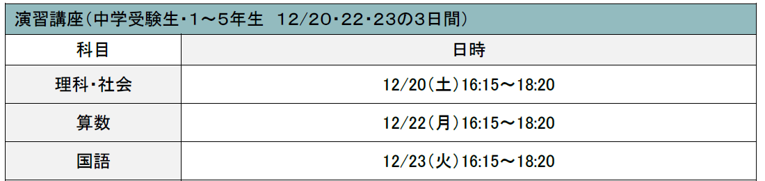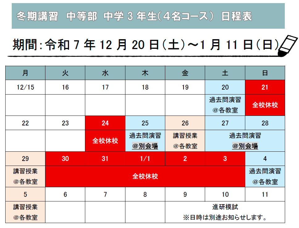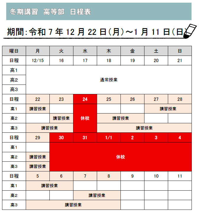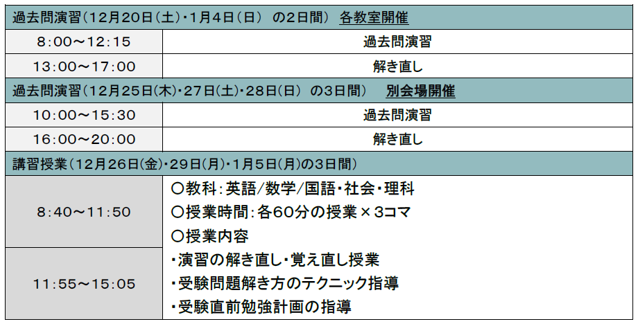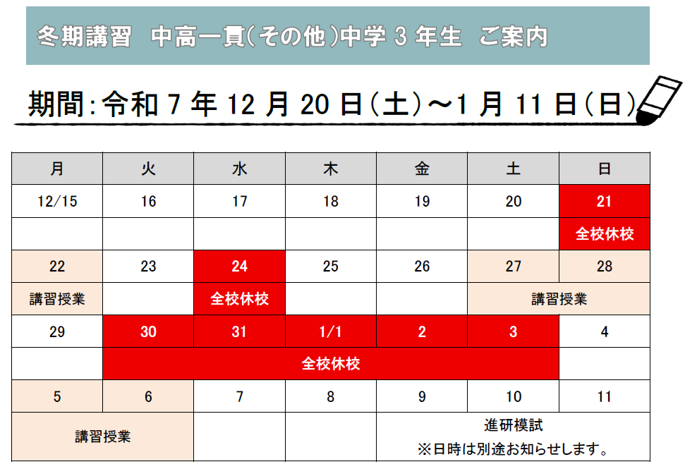 冬期講習では、普段受講している科目の総復習や、受講できていない科目の受講が可能です。高2生以降は受験対策授業となりますので、志望校の受験に必要な科目を受講するようにしてください。
